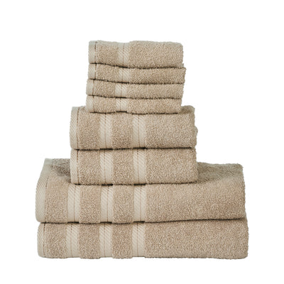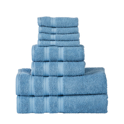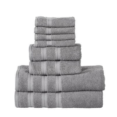 Eight-piece set: 2 bath towels (30” x 54”), 2 hand towels (16” x 28”), 4 washcloths (12” x 12”)