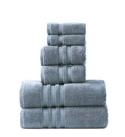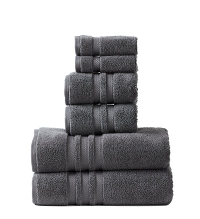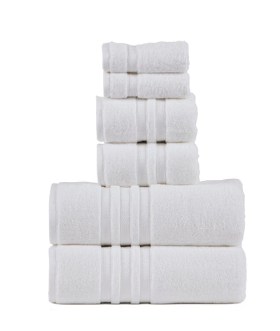 Two 600 GSM bath towels (27 x 54 in), two 580 GSM hand towels (16 x 26 in), and two 550 GSM washclothes (12 x 12).